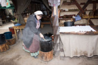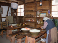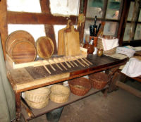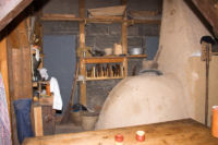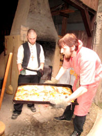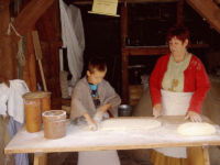 Der Bäcker / die Bäckerin bereitete mit den Knechten und Mägden den Teig für die z. T. auch aus alten Mehlsorten bereiteten Brote bzw. für verschiedene Sorten von Weißgebäck, die im Lehmofen gebacken und mit den Handwerkern gegen Leistungen getauscht oder veräußert werden.