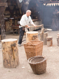 Die Korbmacherin vermittelt ihren Knechten und Mägden die Eigenschaften der unterschiedlichen Weiden und Flechthölzer, das Weichen und Spalten der Ruten, den Gebrauch der Werkzeuge, die Traditionen und Techniken des Flechtens sowie die Gestaltung von Körben.